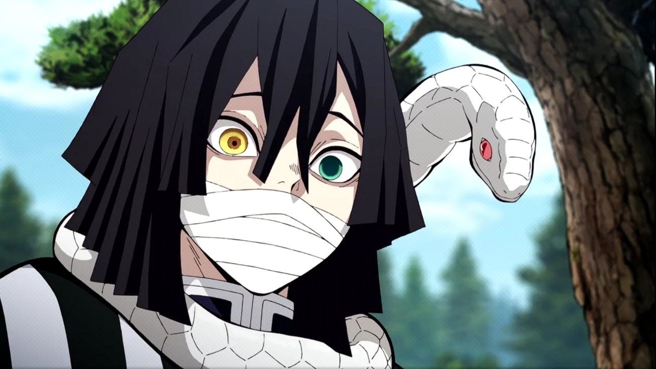 Legenda: Devido a sua cegueira em seu olho direito, Obanai desenvolveu seu estilo de combate junto a sua cobra de estimação, Kaburamaru, que é capaz de analisar os movimentos do seu oponente. Kaburamaru permitiu Obanai continuar lutando ao lado de outros pilares mesmo após ele ficar completamente cego. (Uso Permanente)